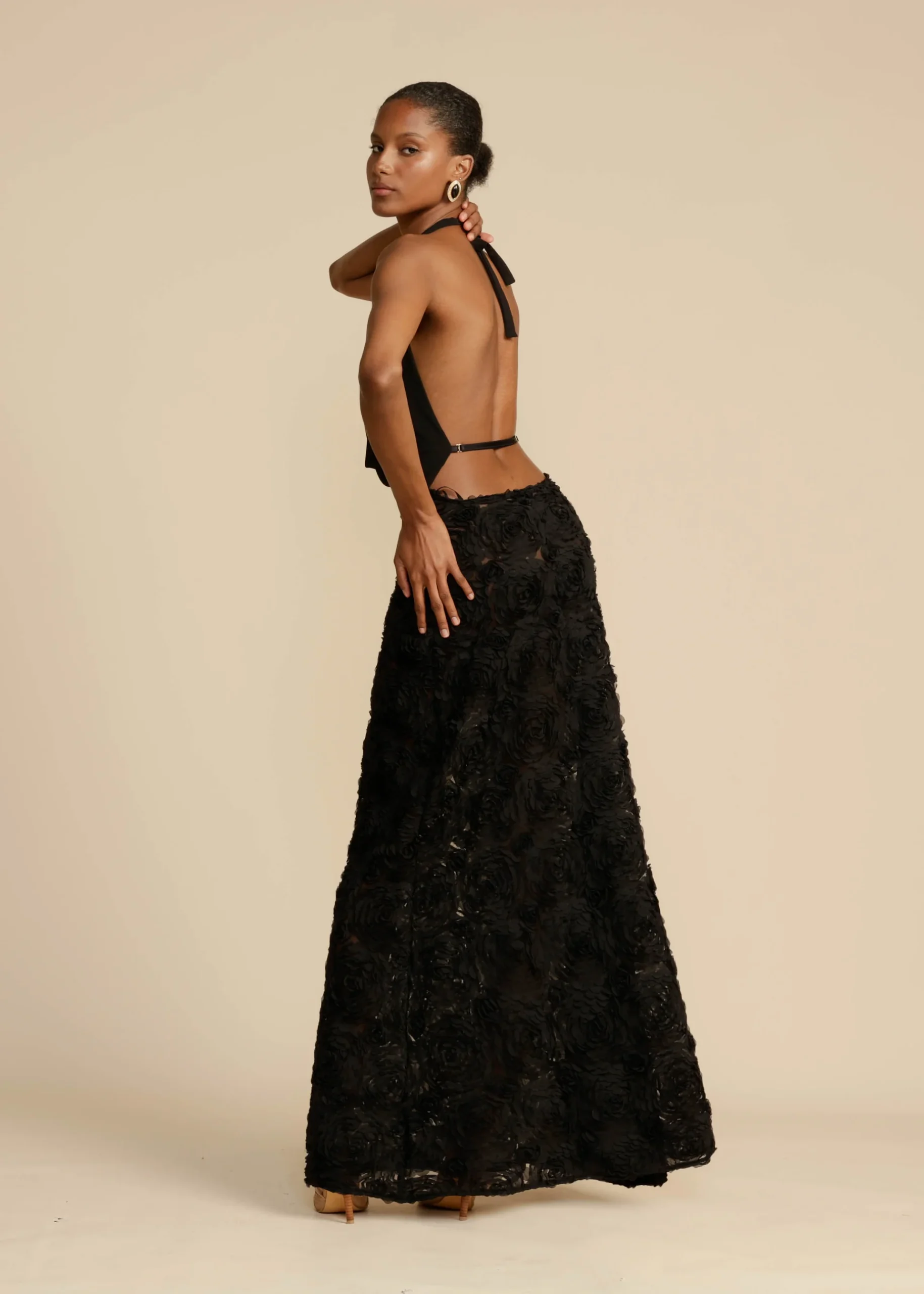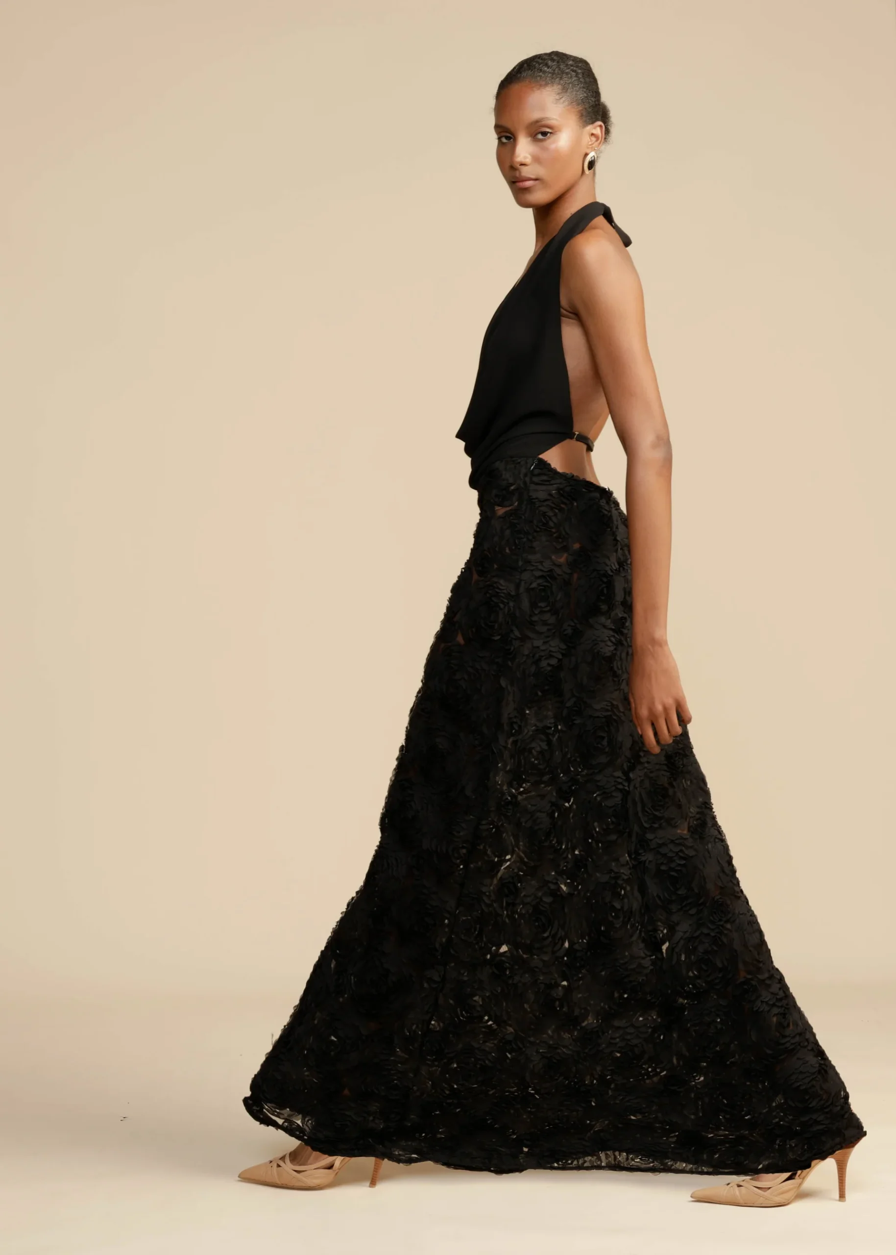 Meet Adriana, a sensually timeless maxi inspired by vintage romance. Fashioned from a luxurious rose applique, beautifully contrasted with flowing georgette that drapes over your bodice. Adriana was designed with focus to flatter the feminine curves. She features a plunging cowl neckline and drop waist that cascades into a full-length A-line skirt. A captivating low back, coupled with an adjustable back strap cinches the waist to achieve the perfect fit. Adriana is an enduring classic, made to be cherished for seasons to come.