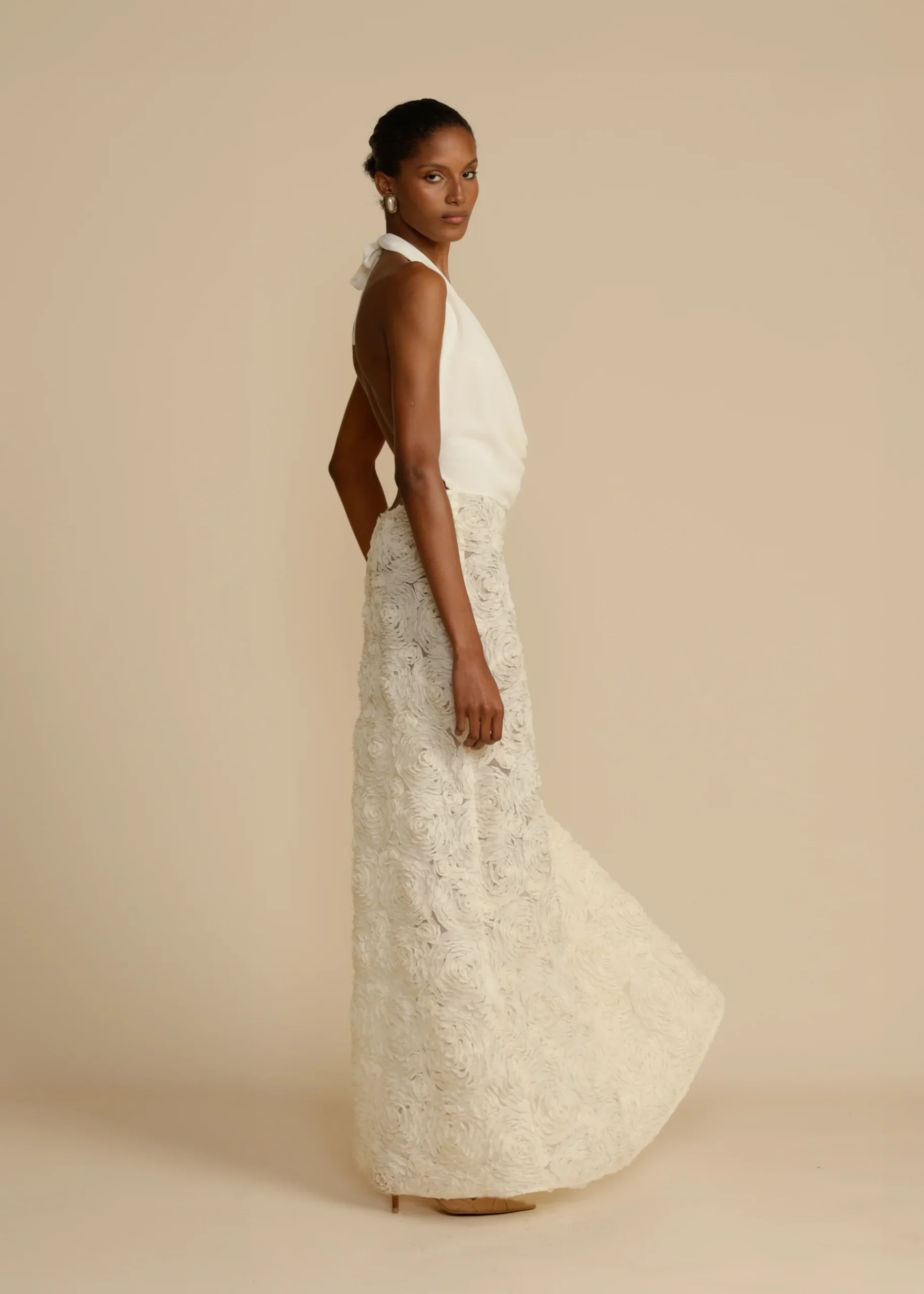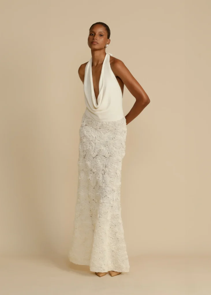 Meet Adriana, a sensually timeless maxi inspired by vintage romance. Fashioned from a luxurious rose applique, beautifully contrasted with flowing georgette that drapes over your bodice. Adriana was designed with focus to flatter the feminine curves. She features a plunging cowl neckline and drop waist that cascades into a full-length A-line skirt. A captivating low back, coupled with an adjustable back strap cinches the waist to achieve the perfect fit. Adriana is an enduring classic, made to be cherished for seasons to come.