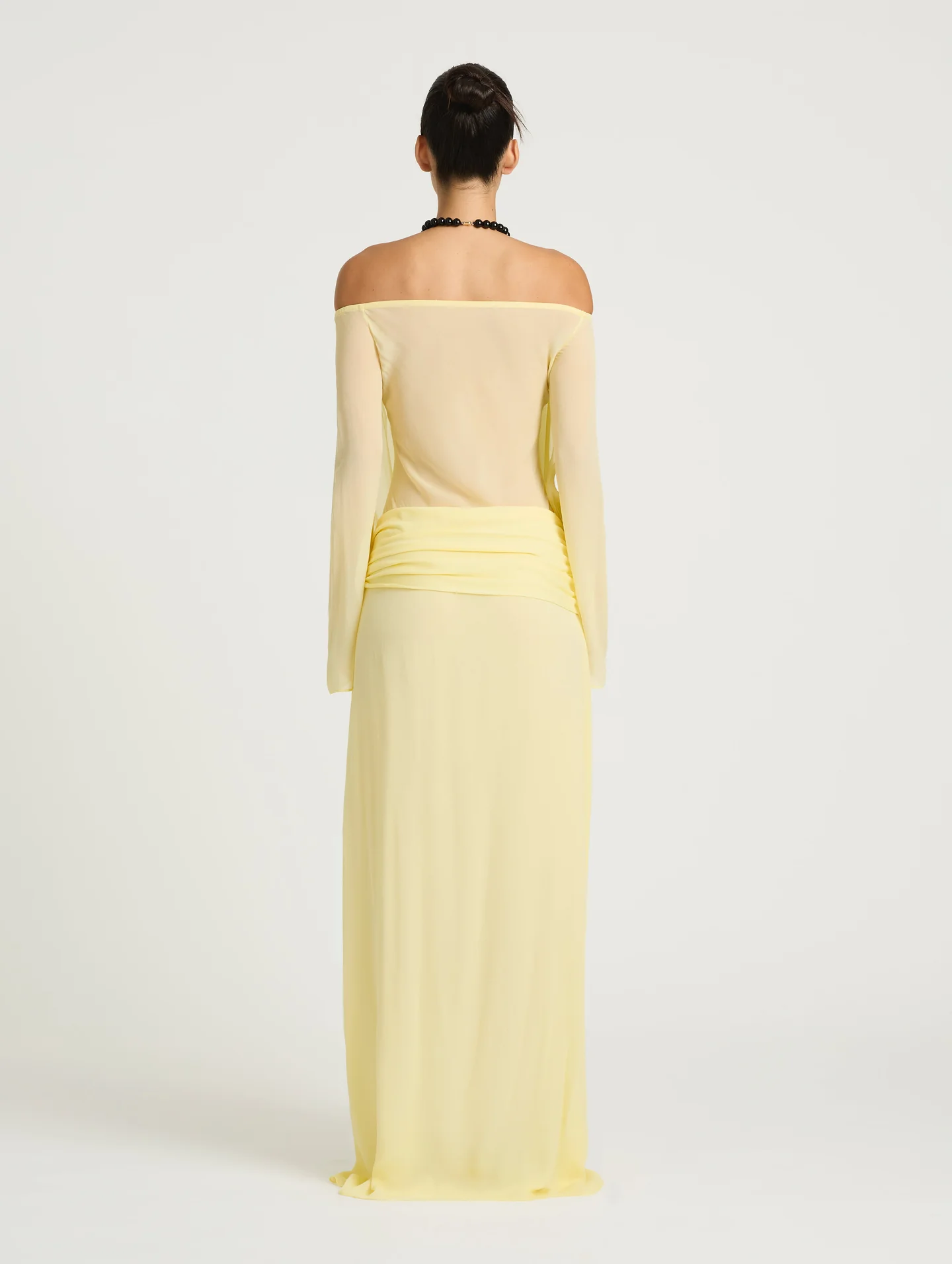 The Bernie Maxi Dress features an off-shoulder design with long sleeves and a sheer maxi-length silhouette. The draped front flows elegantly over the torso and finished with a sash tie at the waist
