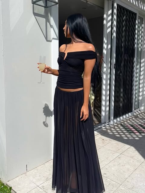 This delicate off-shoulder top, crafted from soft mesh, features a captivating sheer design, perfect for an effortless and feminine look.