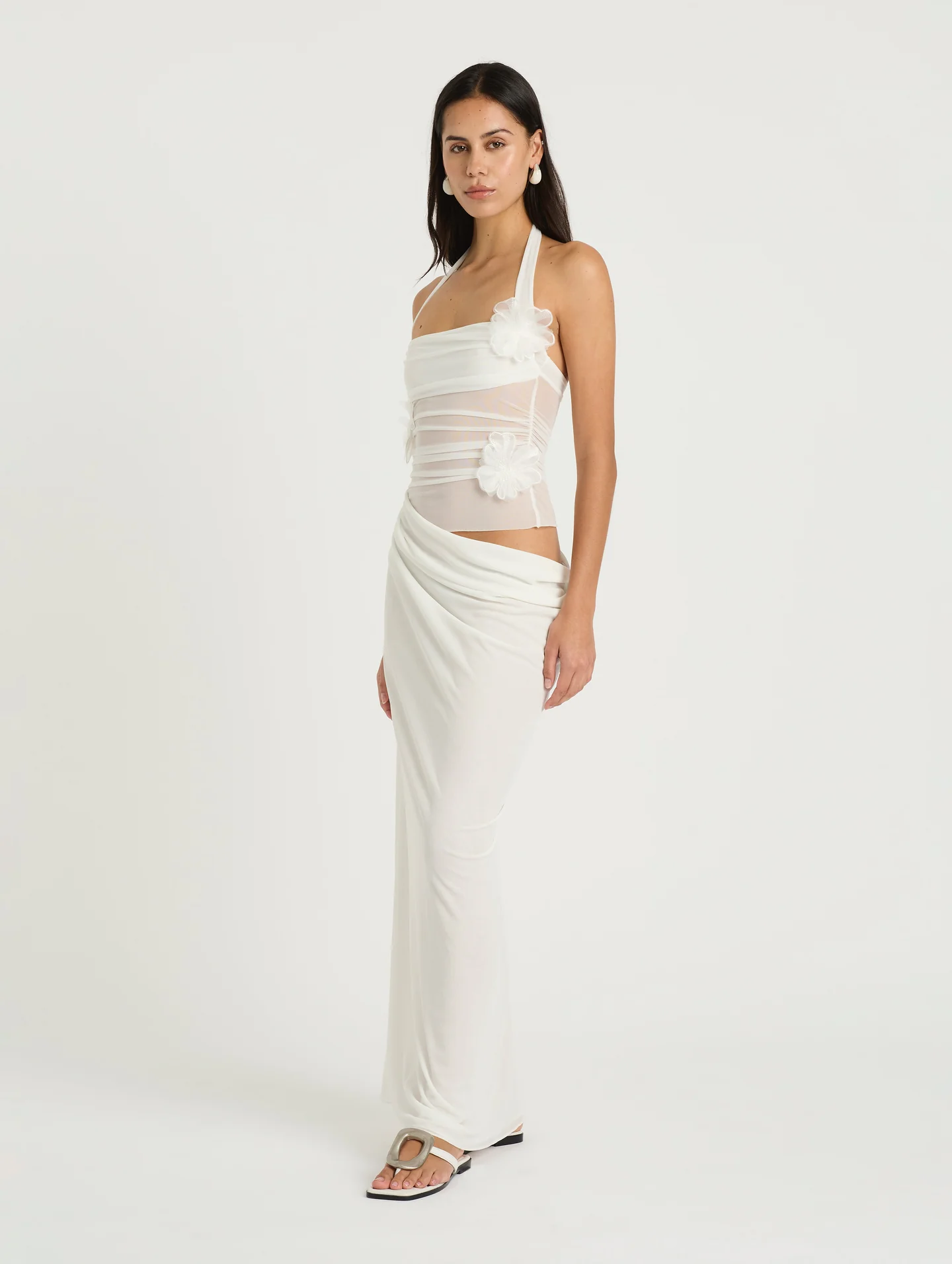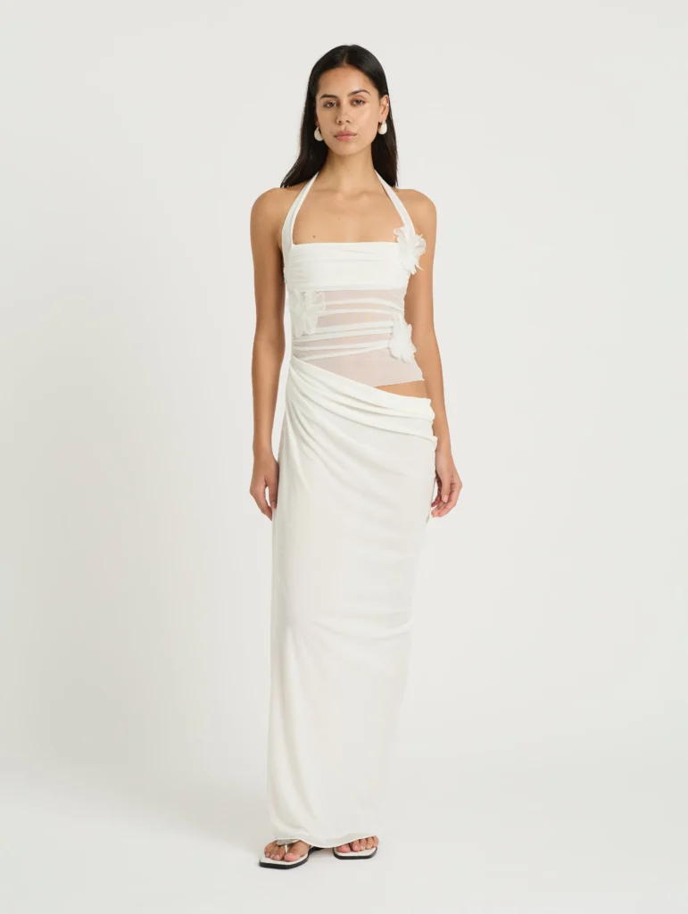 The Florence Maxi Dress showcases a halter mesh bodice with gathered detailing at the waist for a flattering fit. Statement floral decals highlight the top, while the skirt falls to a maxi length and finishes with a soft cowl drape at the wearer’s left side.