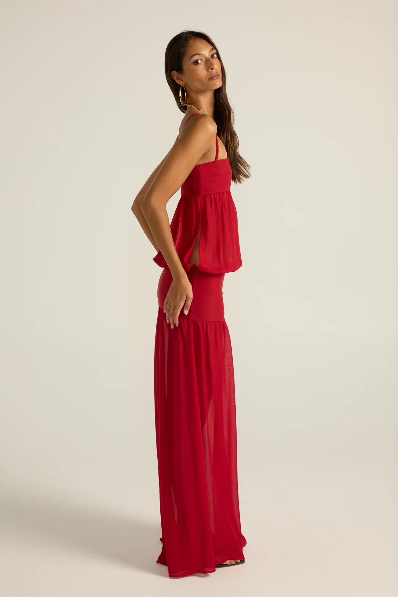 A dreamy blend of structure and softness, with a square neckline, delicate straps, and a fitted waistband flowing into a draped, asymmetric chiffon skirt. The lightweight fabric creates an elegant, fluted silhouette.