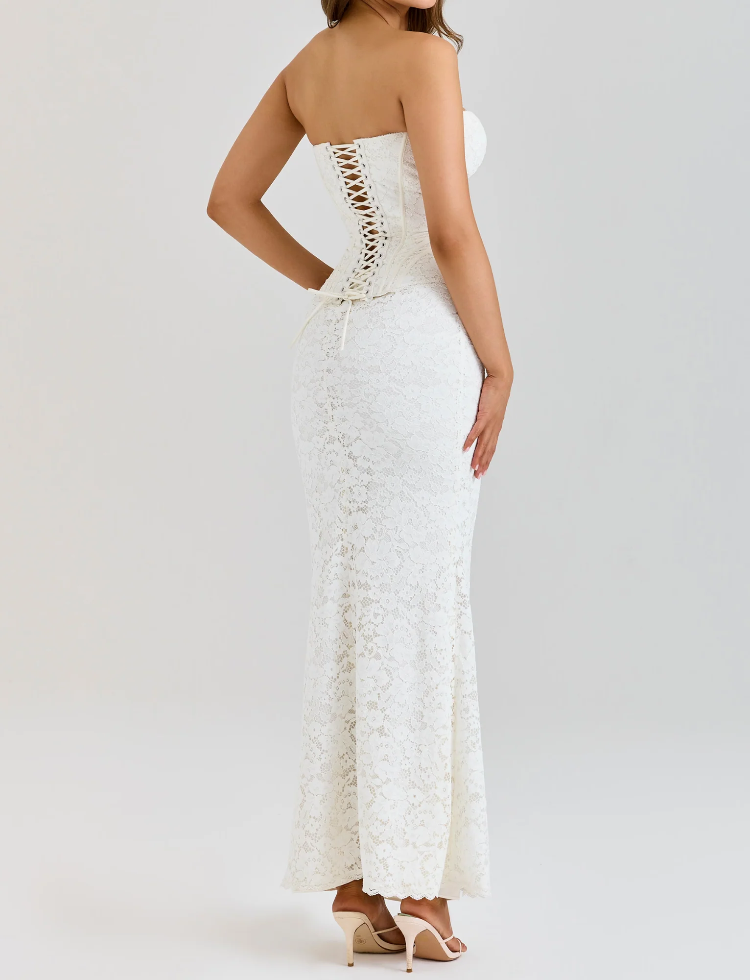 Set to stun at any special occasion, the captivating beauty of ‘Solaine’ catches every eye. This all-in-one floral lace number gives the illusion of a corset and skirt pairing. You’ll find the delicate lace fabric is meticulously crafted to a classic corset top with intricate boning and an underwired bust that provides enough support to leave your shoulders on display. At the back, you can increase the cinch with our signature lace up back and there’s a side zip for added comfort.